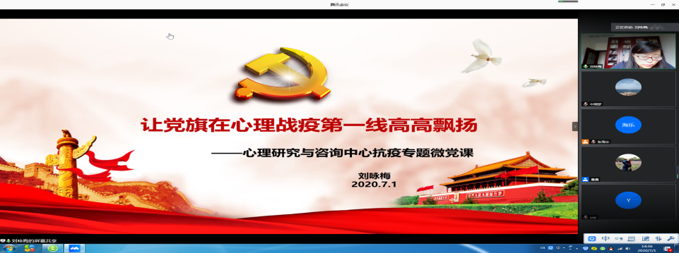 陈华主任在总结发言时指出,打赢疫情防控阻击战中的心理“战疫”,是对党员干部应对突发事件、驾驭复杂局面能力的一次严峻考验,也是对党员教师思想觉悟、工作作风的一次综合检验。“没有人是一座孤岛,哪怕只是倾听、理解和陪伴,都能让学生在心中种下希望的种子”,怀着这一信念,中心的全体党员干部和教师,包括非党员教师,用“心”战疫,用他们的实际行动抒写着自己的初心和使命,践行着全心全意为人民服务的宗旨,让党旗在心理战疫中高高飘扬。陈华主任还对教师入党积极分子和学生入党积极寄予了希望,希望大家在本次疫情防控中锻炼自己。