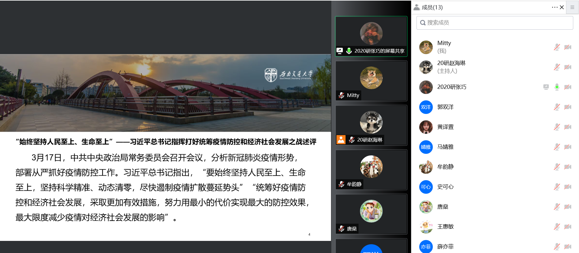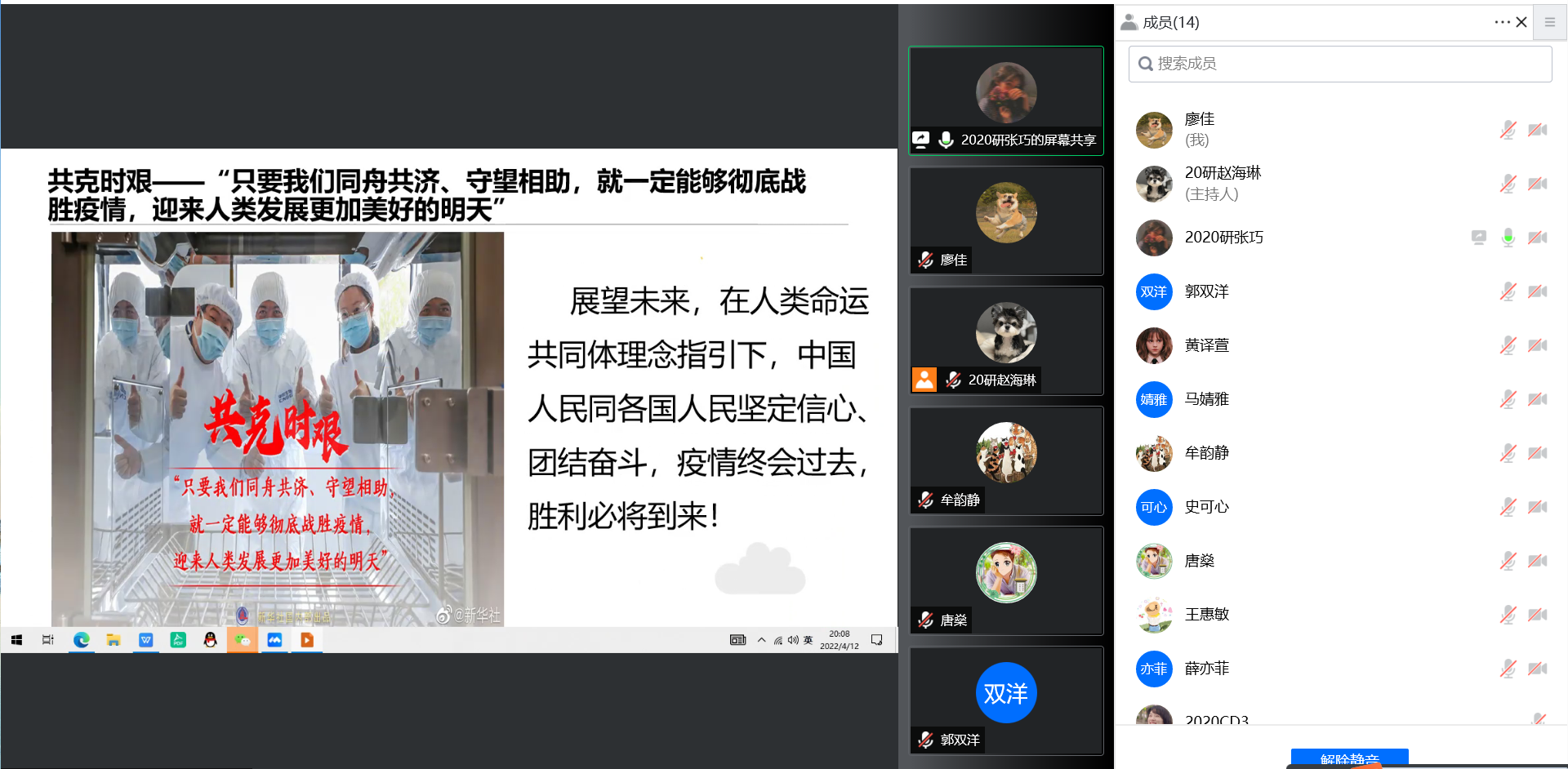2022年4月12日20:00,3d色情 研究生第二党支部全体党员在线上组织学习《习近平总书记指挥打好统筹疫情防控与经济社会发展之战述评》。本次活动由张巧同志带领全体党员同志通过阅读相关资料、观看学习视频等方式进行学习。