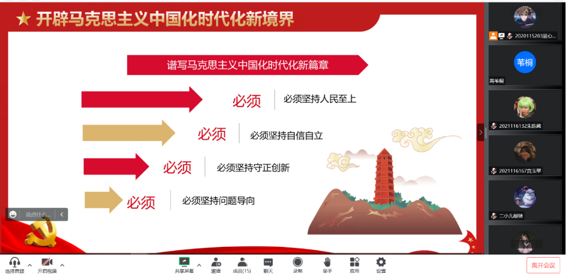 12月5日,学生会主席团成员展心怡同学首先带领大家重温二十大主题,这是大会精神的集中体现,是大会报告的灵魂和主旨,领会好大会主题的丰富内涵,对于全面准确领会大会精神特别是报告的精神非常有帮助。接下来,全体成员共同学习了党的二十大报告中对于过去五年的工作和新时代十年的伟大变革的回顾总结。在此过程中,成员们深入学习领悟到了过去五年工作和新时代十年伟大变革的重大意义,坚定历史自信、增强历史主动,自觉在思想上政治上行动上同以习近平同志为核心的党中央保持高度一致。学习结束后,成员们积极主动地发表了各自的感言,并表示将以青春之我投身国家发展,以青春之力奉献伟大复兴,书写不负党和人民的青春篇章,为实现中华民族伟大复兴的中国梦贡献力量。