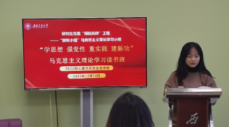接收预备党员大会结束后,2022级心理学研究生党支部组织开展了第三次“学思想 强党性 重实践 建新功”马克思主义理论学习读书班活动。本次读书班活动由刘懿琪、杜仙、吴婕和侯世玲四位同学对《望道——共产党宣言中译本的前世今生》中第九至十二章的内容进行读书分享。同学们也就这四章内容进行了深入的讨论与交流。至此,“学思想 强党性 重实践 建新功”马克思主义理论学习读书班的活动就此告一段落,但同学们永远不会停止学习的脚步,也会在实践中不断检验学习成果。