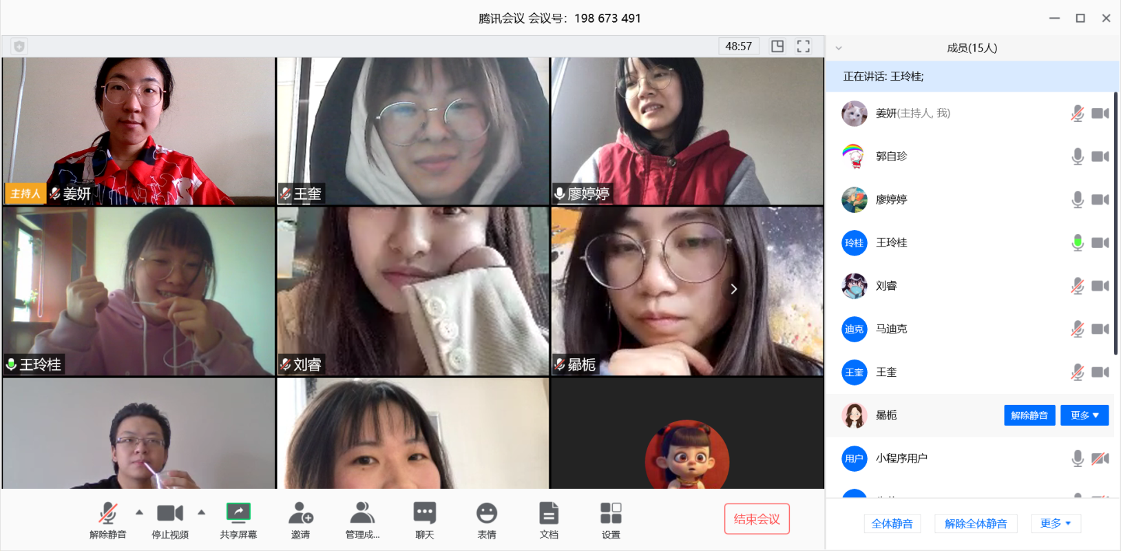 班会第二项,全体与会成员围绕“宅家学习”期间的科研方法及成果,从各自的开题报告进度、学习方法、阅读书籍文献推荐等方面入手。通过互相分享,激励同学们不能因为宅家而松懈,激发同学们新的科研灵感及问题解决方法。