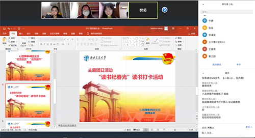 2020年3月31日周二晚上,2018级应用心理1班的班会如期在线上举行。班会主题为:“读书纪春光"读书打卡活动企划。班会主持人为团支书王千惠。与会人员为2018级应用心理1班同学。