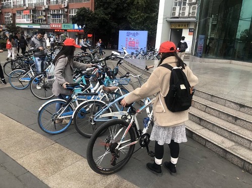 一二食堂门口,开展自行车协助摆放活动。