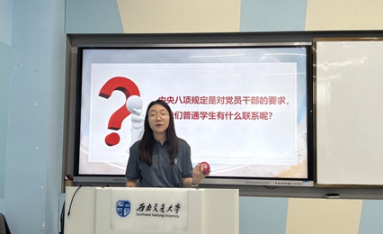 2024级研究生党支部开展了“作风建设永远在路上——深入贯彻中央八项规定精神学习教育”专题党课学习。此次专题党课由支部党员杨铭璐同学主讲,全体党员和积极分子参加学习。