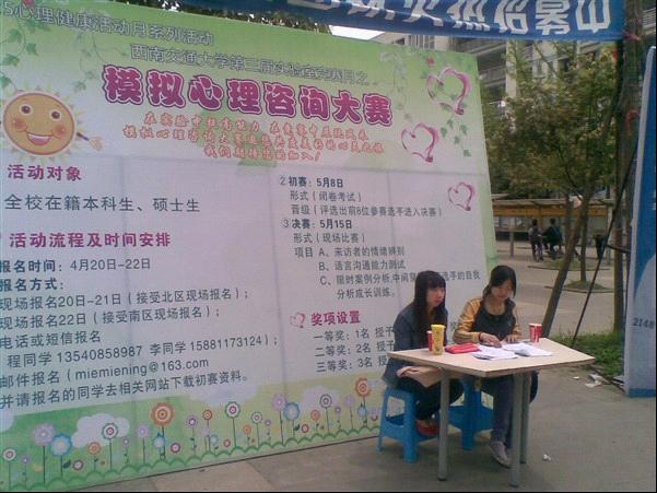 此次模拟心理咨询大赛在我校实属首届,但前来报名的同学却是络绎不绝。活动采用现场报名、短信及电子邮件报名的方式,截至5月4日晚,共收到来自19个院系、68名同学的报名申请,除本科生外,另有两名硕士研究生和一名博士研究生报名参赛。报名者中不乏应用心理学专业的同学,他们都想通过此次竞赛“小试牛刀”。而其他报名者均对心理学充满着浓厚兴趣,他们来自不同院系,不同年级。许多同学虽不是“科班出身”, 也并未接受有关心理咨询的专业训练,但他们平时阅读了大量心理学书籍,旁听过中心老师的众多课程,如青年心理学、消费心理学等,对自己的实力也是自信满满。他们希望通过这次比赛能有所收获、有所提高,在日常生活中运用一些心理咨询技巧自助和助人。
