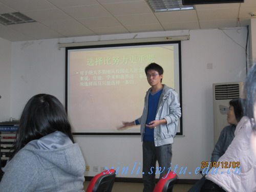 在班干部的带动下,同学们纷纷走上讲台,与大家分享读书体会、心得。许多同学都阅读了《求职,从大一开始》一书,对个人的职业生涯有了初步的打算。组织委员刘雪林在现场作一个小小的调查,全班同学约有三分之一的同学打算考感研,有三分之一的同学想毕业工作以后步入商界,其余仍在思考中。通过学习讨论,同学们都认识到“选择比努力更重要”。从现在就应该做好职业生涯规划,选择发展方向,大学四年朝着这个方向去努力。