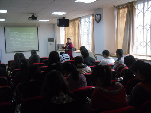 张老师的讲座分两个方向:一个是就业,另一个是升学。就业方面,老师主讲了PETS(Public English Test System)、BEC(business English Certificate)和TOEIC(Test of English for International Communication)。她讲了这3种考试各自的特点、作用、社会认可度、考试时间以及考点等。张老师还特别建议同学们去参加PETS 和TOELC这两种考试,因为它们对于进入外企、世界五百强企业等有很大的帮助。