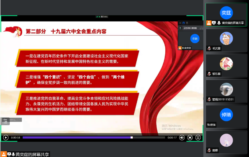 疫情防控要求,本次活动使用腾讯会议线上开展,并由2019级1班团支书黄奕莛主持,2019级1班同学参与。
