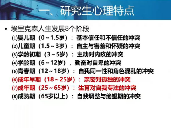冉老师首先用著名的发展心理学理论——埃里克森的人生发展八阶段论作为本次讲座的引入,重点讲解了研究生年龄阶段的心理特点,主要是成年早期(18-25岁)亲密对孤独的冲突以及成年期(25-65岁)繁衍对停滞的冲突。冉老师强调人格成长的重要性,并梳理出了研究生阶段的发展目标,主要包括:整合过去、现在和未来而获得自我同一性;发展亲密关系,包括但不限于婚恋;做好职业规划,乃至人生规划,目标导向,以终为始。