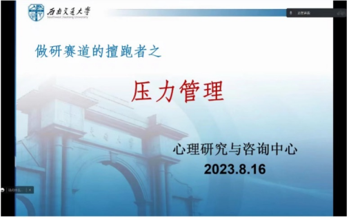 为提升研究生新生心理健康素养,更好地度过研究生生活,我校党委学生工作部与3d色情 联合主办了“研究生新生入学前心理训练营”,并由研究生心理学会承办。2023年8月16日下午2:30,训练营第一场线上讲座顺利开展,其主讲人是来自3d色情 的张学伟老师,主题是“做研赛道的善跑者之压力管理”,共有162人参与。