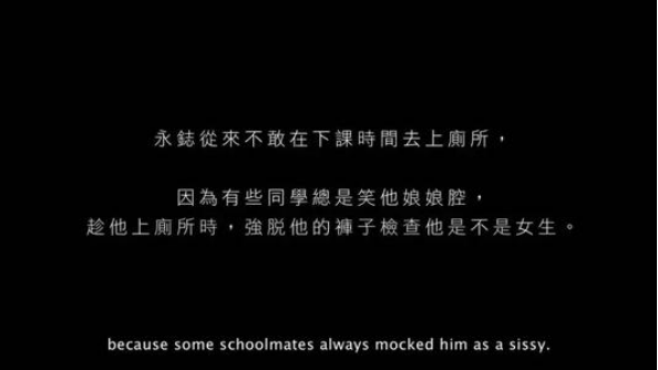 因为不同,叶永志被班上的男生孤立。就算妈妈和心理医生都觉得他没“病”,学校里的同学和老师依然没有停止嘲笑,殴打他,脱他的裤子,就为了检查他是不是女生。