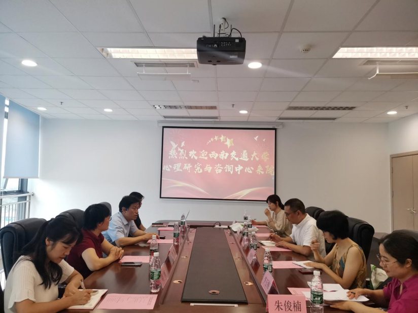 四川省精神医学中心主任周波、中心公共卫生事业部主任李慧、教育培训部周颖、苟练等老师热情接待。在介绍双方机构的职能以及基本建设情况后,周波主任、雷鸣副主任等就建设心理健康绿色通道、应用心理学专业本科实习基地等事宜进行交流。