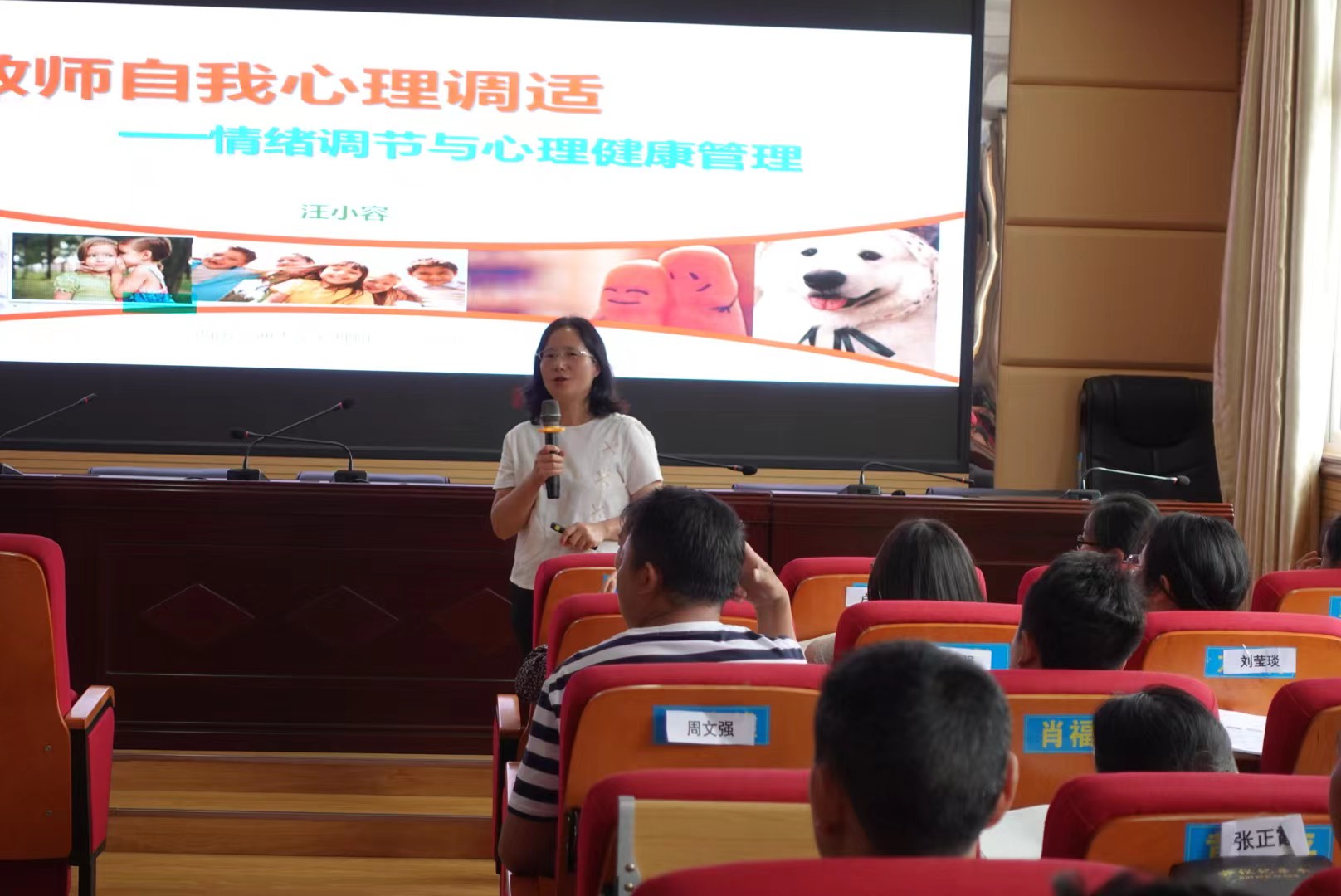 汪老师以“教师的自我调适—情绪调节与心理健康管理”为题,结合生动案例,分享与讲解了教师情绪调节与心理健康管理的具体方法。汪老师说:“积极地面对待生活、工作与学习,改变自己的观念,以乐观的态度去看待问题、思考问题.......!”