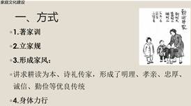 家庭文化建设有五个有效的途径。第一是著家训;第二是立家规;第三是形成家风,讲求耕读为本、诗礼传家,形成了明理、孝亲、忠厚、诚信、勤俭等优良传统第四是身体力行。