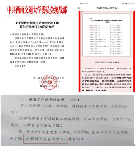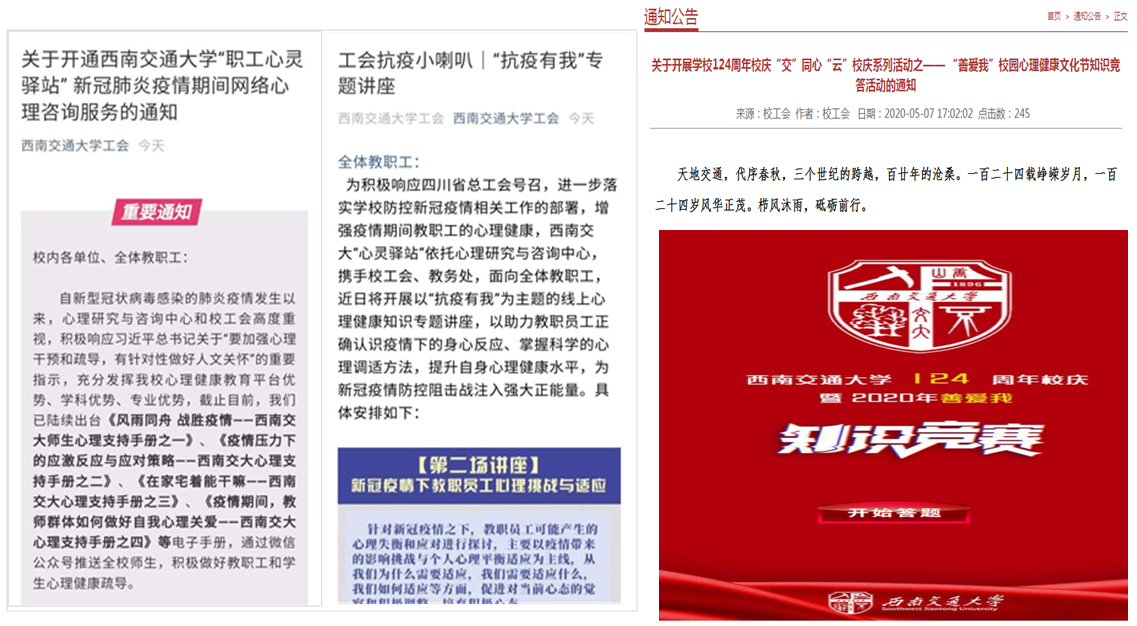 联合校工会及时开通疫情防控心理援助专线,开展全校性线上心理讲座2次,教职工心理危机干预2次,推出西南交大心理支持系列电子手册4期,为广大教职工提供专业的心理防护指导和建议。开展“善爱我,敬畏生命,交同心,科学防疫”为主题的疫情防控、心理防护和校史校情知识竞赛,全校4201人,68547人次教职工参与网上竞答和防疫知识普及,助力学校复学复课工作。