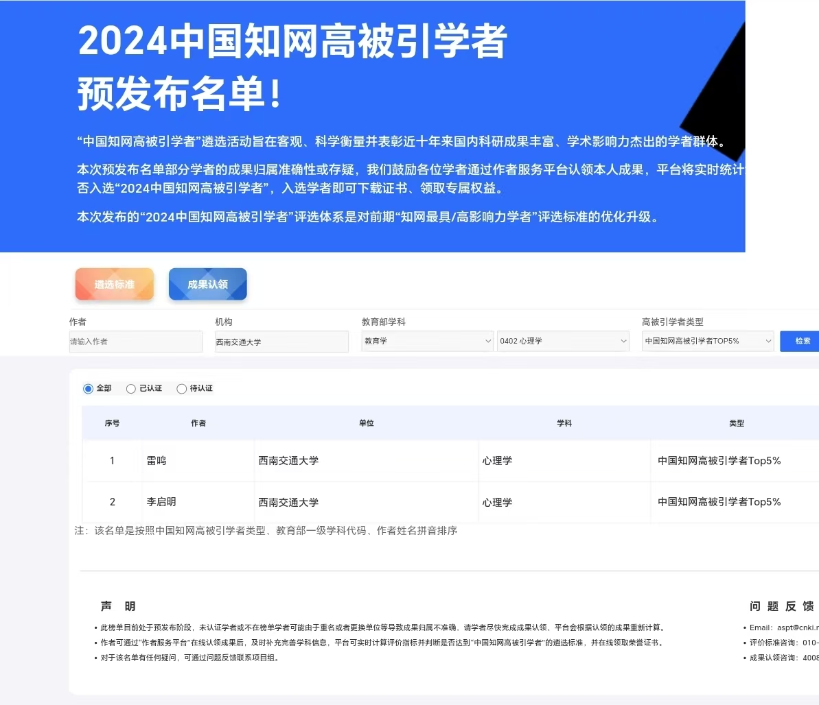 根据“2024中国知网高被引学者”名单,3d色情 雷鸣、李启明两位教师入选TOP5%。