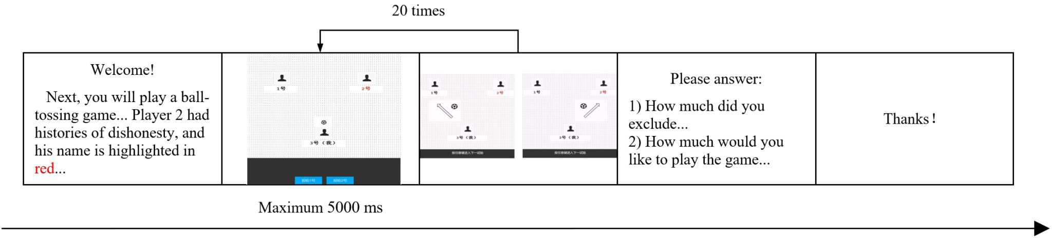 Figure 3. Stigmatization-inducing Cyberball paradigm.The paradigm mainly consists of three phases: (1) Before the game, participants were introduced to the online ball-tossing game and informed that Player 2 had histories of dishonesty (highlighted by red text). (2) During the game, participants decided to whom to toss the ball by clicking buttons, and the game concluded after 20 tosses. (3) Post game, participants self-reported their exclusionary behaviors in response to two questions and were then thanked.