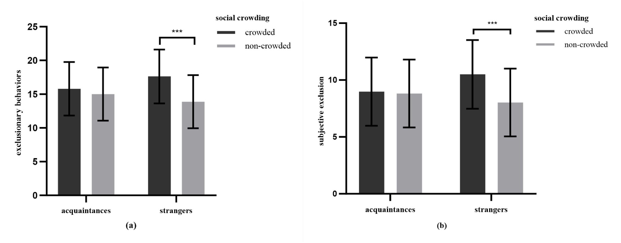 Figure 4. Simple effects analysis of exclusionary behaviors (a) and subjective exclusion (b).