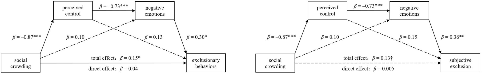 Figure 3. Sequential mediation model for the effect of social crowding on exclusionary behaviors and subjective exclusion via perceived control and negative emotions (n = 171).