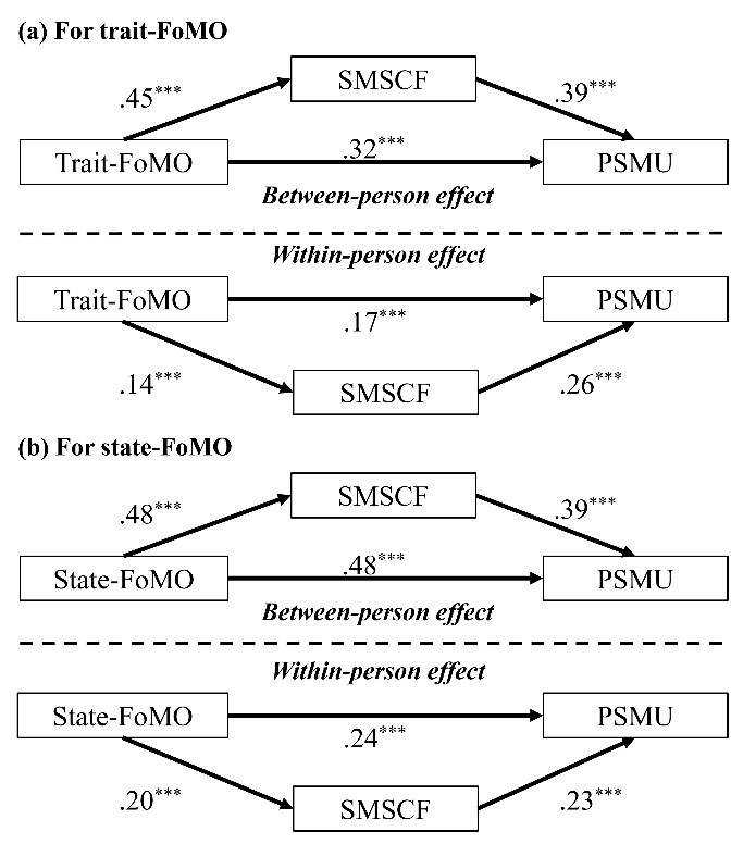 结果显示,无论是特质错失恐惧(trait-FoMO)还是状态错失恐惧(state-FoMO),均能直接、间接通过社交媒体自我控制失败显著正向影响问题性社交媒体使用。具体来说,在个体间水平,错失恐惧水平较高的群体会报告更多的社交媒体自我控制失败,进而具有更高的问题性社交媒体使用风险;在个体内水平,随着时间的推移,错失恐惧水平较高的个体会报告更多的社交媒体自我控制失败,从而表现出更高的问题性社交媒体使用风险。