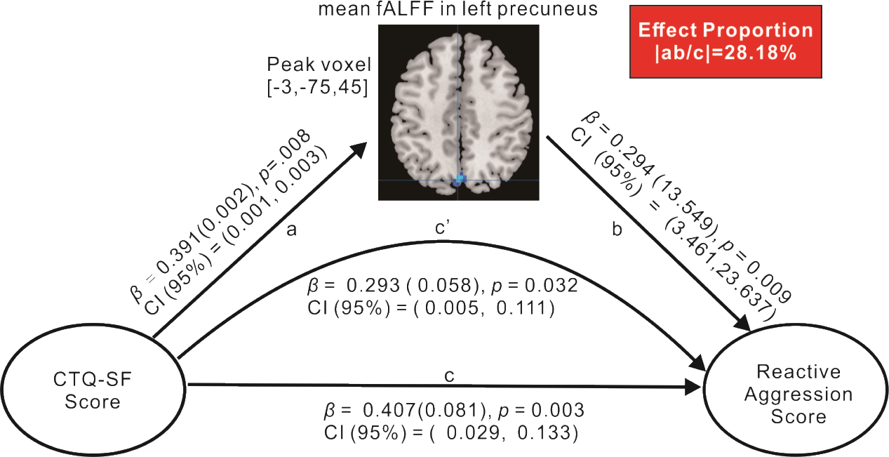 图1:左楔前叶平均fALFF介导童年创伤与反应性攻击(RA)评分相关性的中介模型