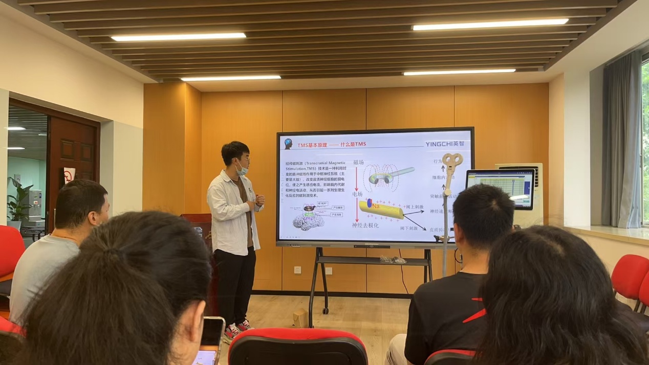 在技术操作部分,高老师带领参与者实地演示了TMS设备的启动、参数设置及实验实施流程。他特别强调了安全操作的重要性,详细讲解了线圈放置的精准定位方法、刺激强度的个性化调节,以及可能的副作用和应对措施。随后,高工程师结合多个心理学实验实例,说明了TMS技术在研究中的广泛应用。培训重点聚焦TMS在认知神经科学领域的实践价值,包括用于研究记忆加工、语言功能、注意力控制及情绪调节等课题的实验设计。他特别提到,TMS在治疗抑郁症、焦虑症及其他精神疾病中的临床应用正日益受到关注,并分析了当前技术在跨学科研究中的发展潜力。