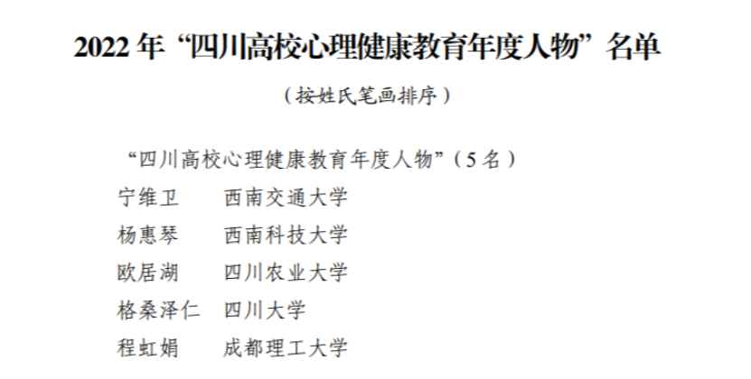 教授委员会主任宁维卫教授获评“四川高校心理健康教育年度人物”。据悉,此奖项为首次评选,全省仅有5人获此殊荣。