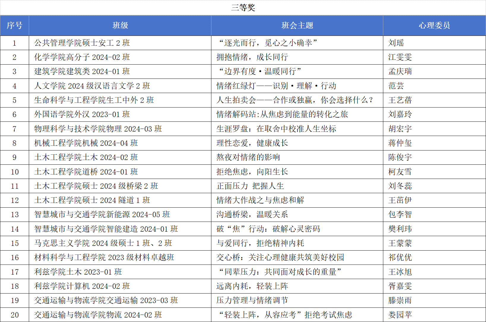 2025年度学校“交心桥”心理班会展示会经学院初赛推荐、展示会复赛、决赛,评选出特等奖2项、一等奖3项、二等奖5项、三等奖20项、优秀奖28项以及心理委员个人特色奖3项。现将获奖名单公布如下: