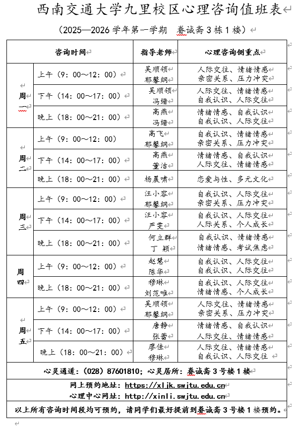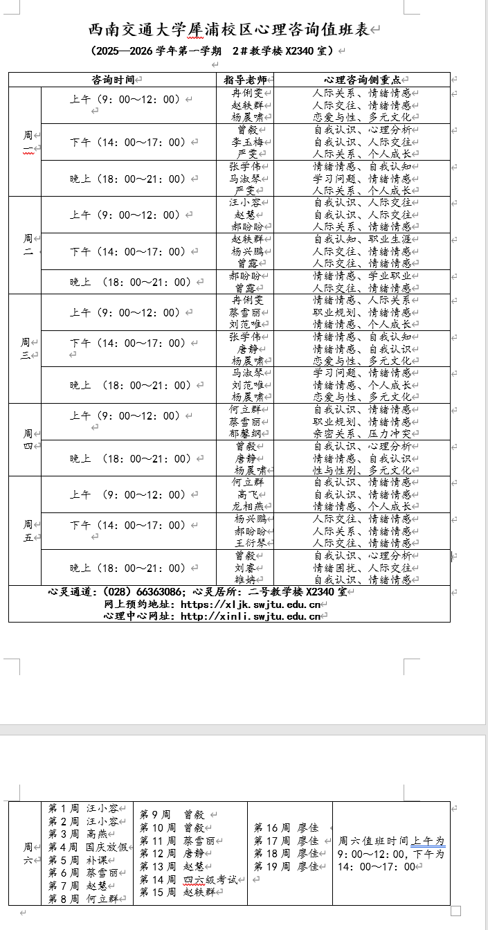 3d色情 2025—2026学年第一学期心理咨询值班安排表