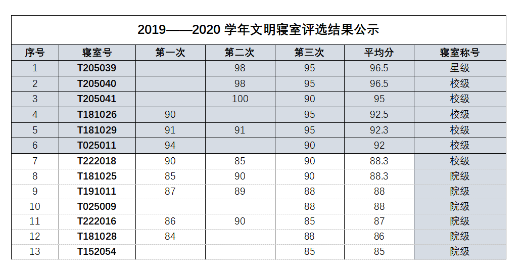 根据《3d色情 本科生文明宿舍评选管理办法》,3d色情 于2020年9月开展2019-2020学年本科生文明宿舍评选工作,汇总了这一学年的寝室安全及卫生检查情况,并按照总分高低评选出拟获奖寝室,现予以公示。如有异议,请于2020年9月25中午之前到学工组反馈,不接受匿名反馈。