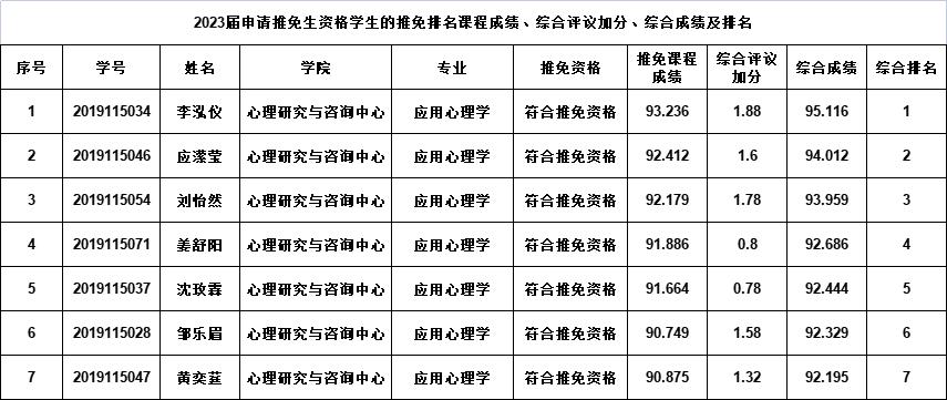 【推免】应用心理学本科专业2023届申请推免生资格的学生综合成绩排名公示