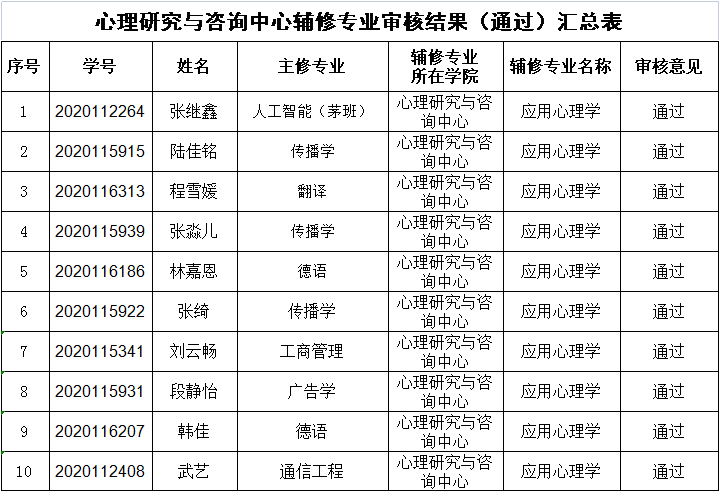 根据《3d色情 本科生辅修专业修读及辅修学位授予管理办法》文件规定,经学生本人网上申请,教学工作组审核,拟同意张继鑫等10名学生辅修应用心理学专业申请,现予以公示。