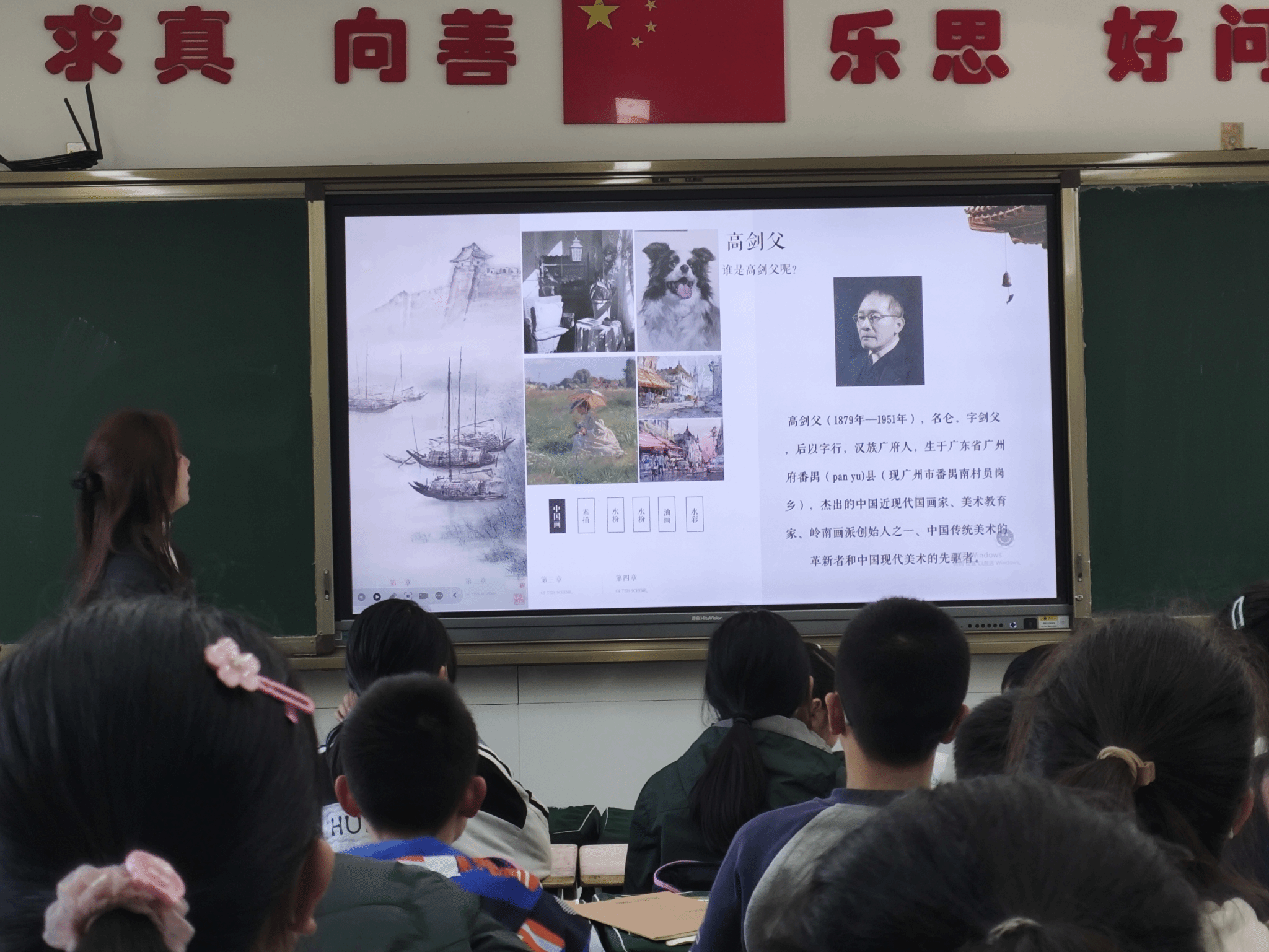 第二章老师向同学们介绍了高剑父以及带同学们欣赏高剑父的画作,同学们都看得很入迷仿佛身临其境,频频发出赞美之声。
